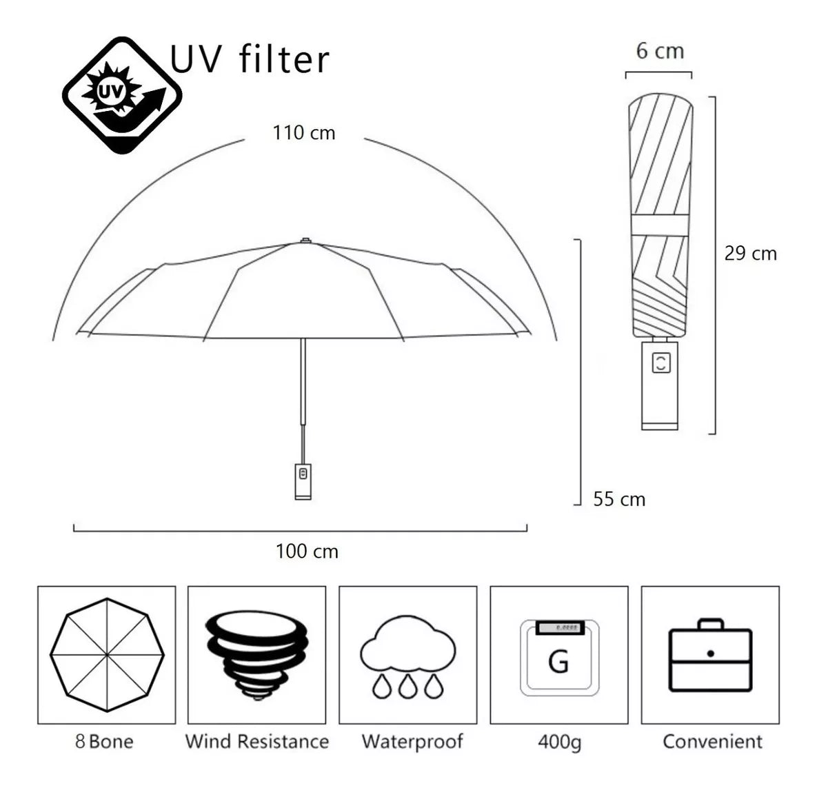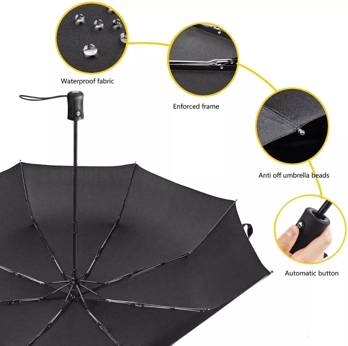 Estructura reforzada y materiales antioxidantes mantienen la sombrilla intacta. Evita regresar empapado o cambiarla a mitad del día, ideal para días lluviosos o muy soleados.